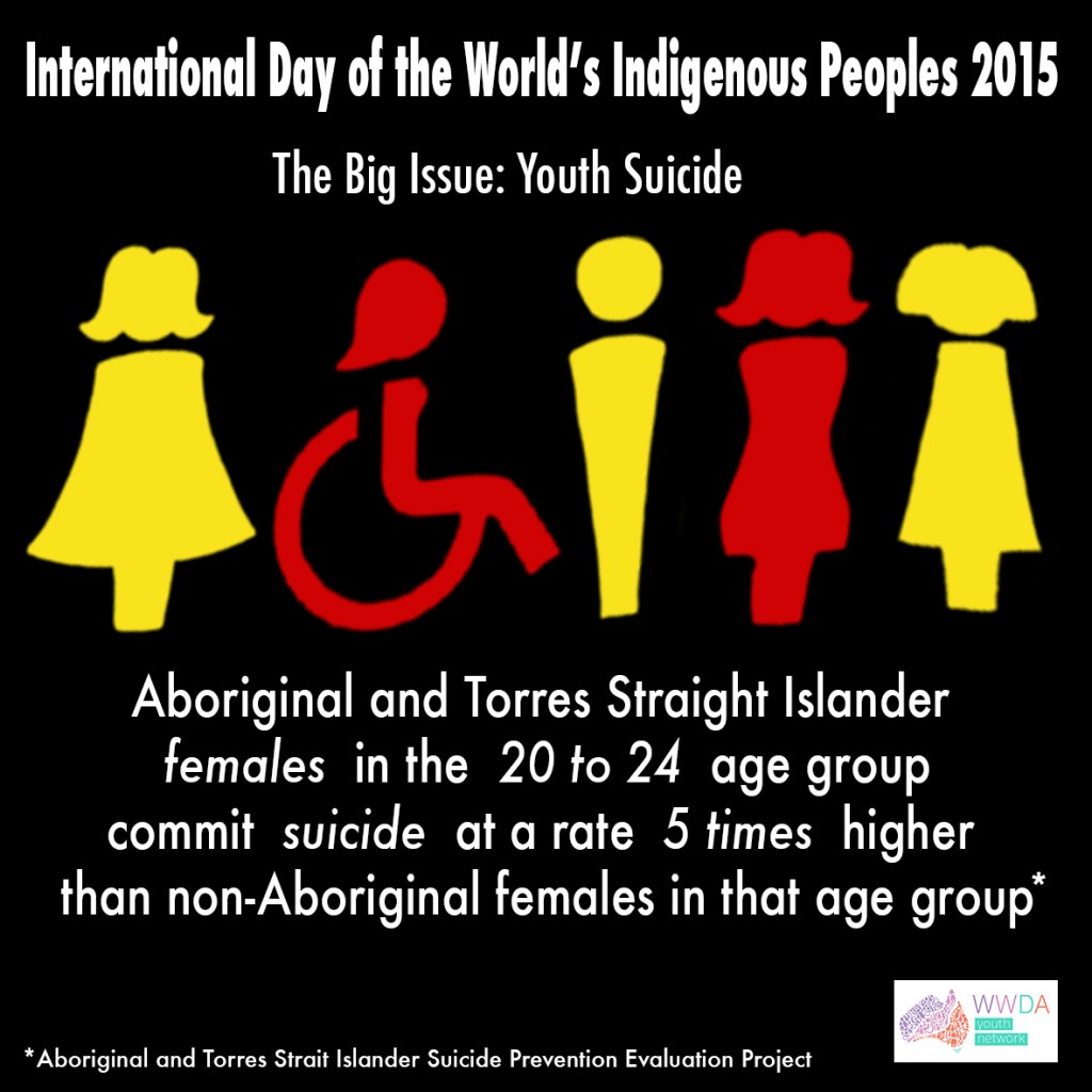 Today, 9th of August, is the International Day of World’s Indigenous Peoples 2015. The WWDA Youth Network would like to focus on the issue highlighted by young Indigenous peoples at the 2015 UN Permanent Forum on Indigenous Issues – Self-Harm and Suicide.“Across Australia, young Indigenous Australians up to 24 years old are 5.2 times more likely to die due to intentional self-harm than other young people in the same age range.” ¹