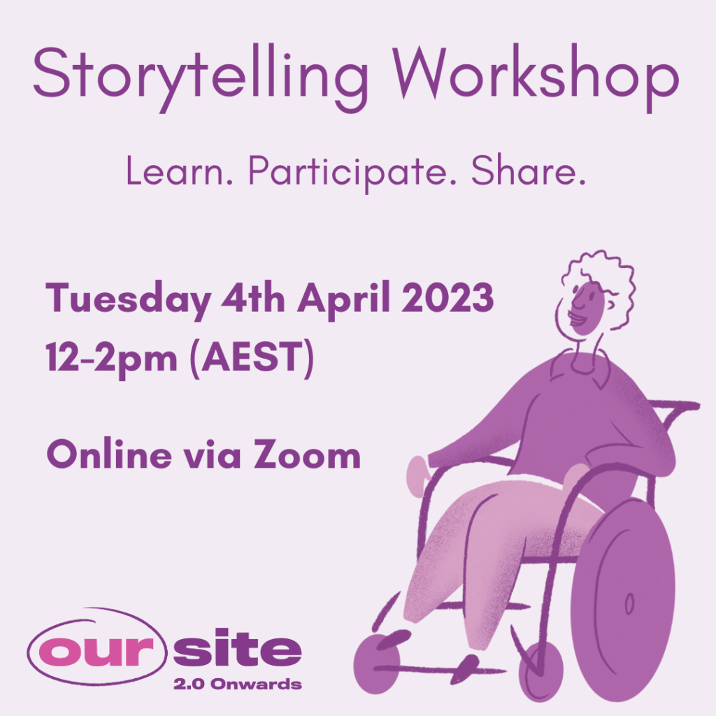 This March is the third anniversary of the launch of Our Site! To celebrate the anniversary, Our Site will hold an online storytelling workshop on Tuesday, 4 April 2023. We will help women, girls, and gender-diverse people with disabilities to tell their stories and about all the different mediums they can use to share their stories.
