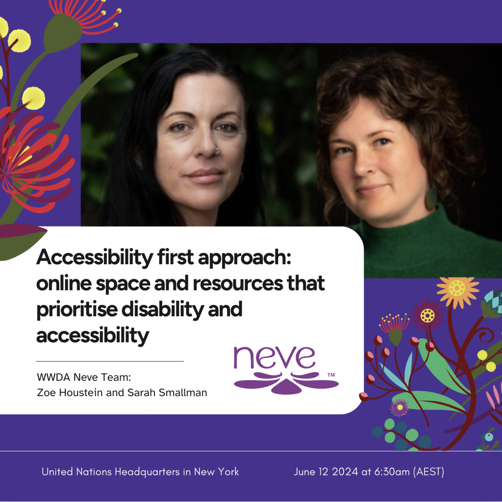 In June 2024, the Neve team held a virtual side event at the 17th Session of the Conference of States Parties to the Convention on the Rights of Persons with Disabilities (COSP17). The event, Accessibility First Approach: Online Space and Resources Prioritising Disability and Accessibility, highlighted WWDA’s innovative approach to resource development, focusing on co-design principles and accessibility standards. Attendees gained insights into Neve, an Easy Read website catering to women and gender diverse individuals with disabilities, fostering empowerment, and accessibility.