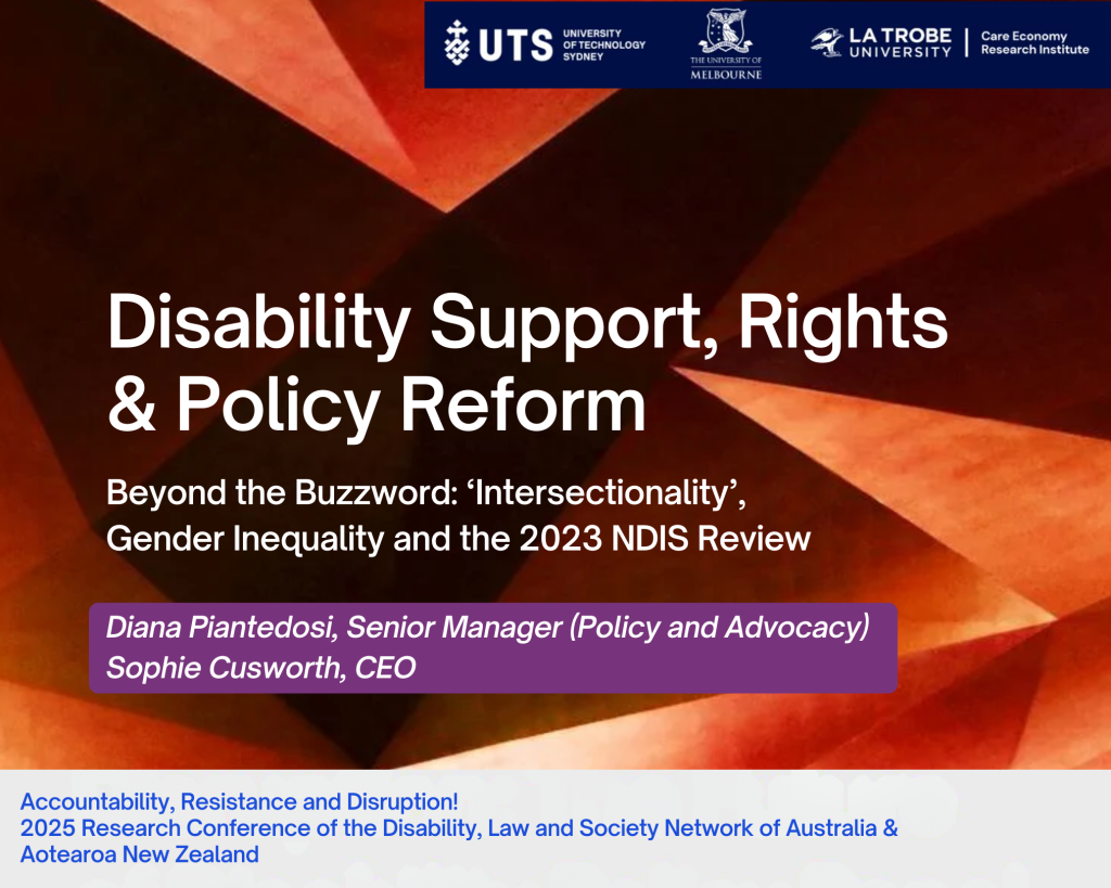 Her presentation, “Beyond the Buzzword: ‘Intersectionality’, Gender Inequality and the 2023 NDIS Review’ explored how intersectionality is currently used in Australian law and policy, making the point that intersectionality is not a catch-all for diversity. It means policies that impact us should consider us. It means co-design, transparency and rights-based decision-making that reflect different experiences and voices.